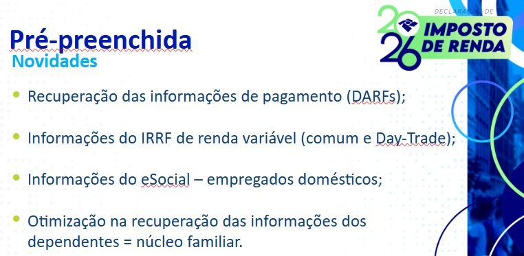 Dentre as inovações do IR 2026 destaca-se a capacidade de inserir o nome social e também a etnia para titulares e dependentes, quatro lotes de reembolso em vez de cinco, cashback automático para aproximadamente 4 milhões de pessoas que não devem declarar e extensão da declaração pré-preenchida.