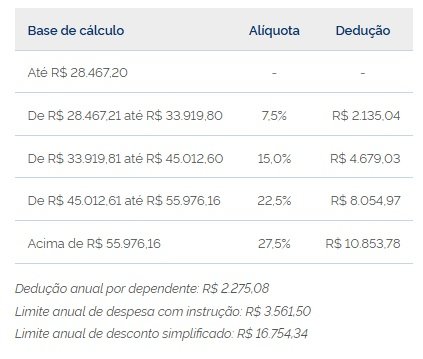 Para a declaração de ajuste anual, a tabela para o cálculo do Imposto de Renda devido é a seguinte: