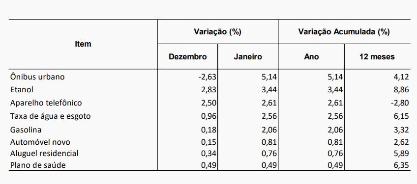 Além disso, em Transportes, a passagem ônibus urbano aumentou 5,14% em janeiro, principalmente devido a reajustes tarifários em várias metrópoles como São Paulo (9,18%) e Rio de Janeiro (5,32%).